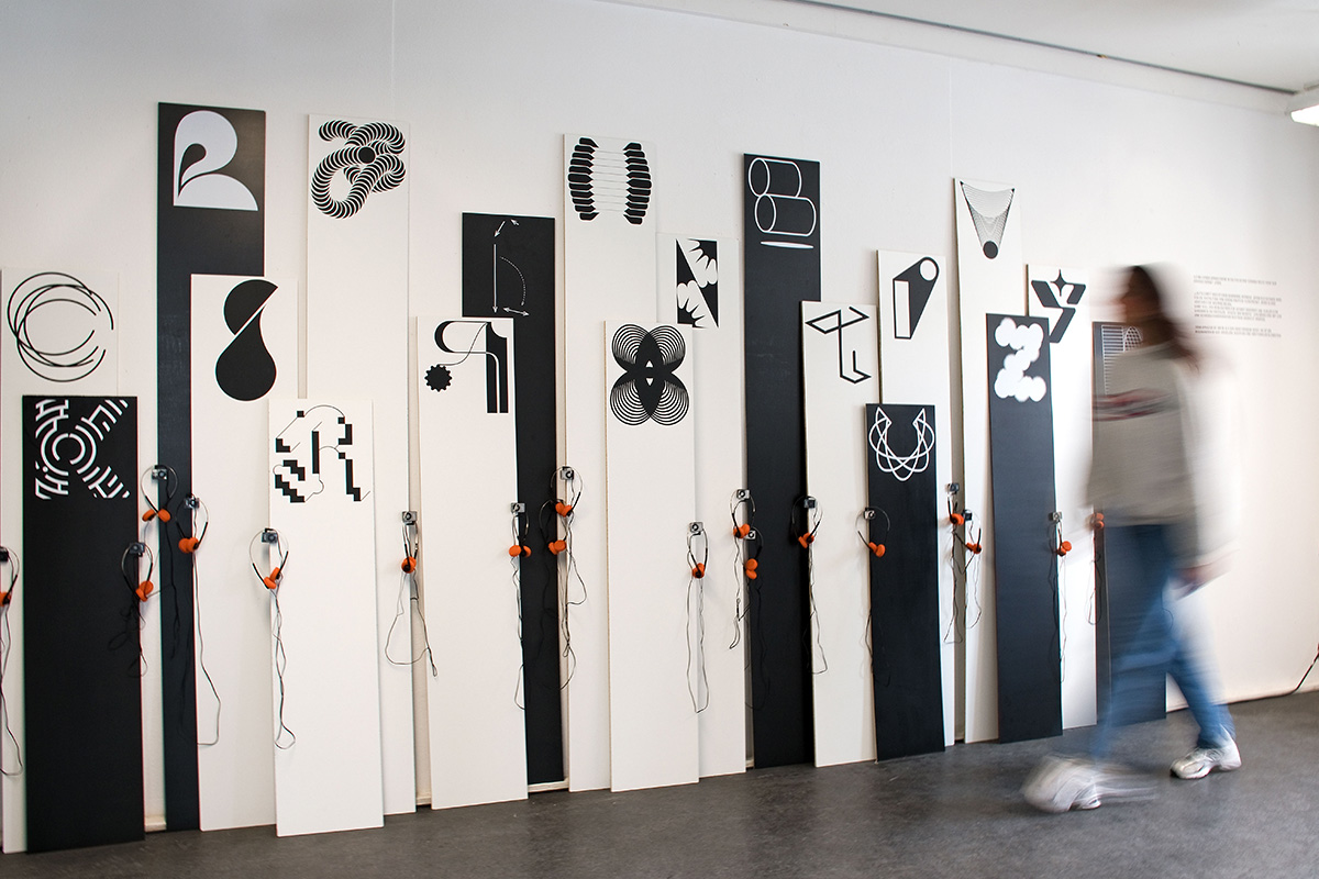 Anfangsbuchstaben teilen. So entstanden teils stark abstrahierte Buchstabenformen, die auf hohen Holzplatten im Raum präsentiert wurden. Um das Erlebnis zu vertiefen, habe