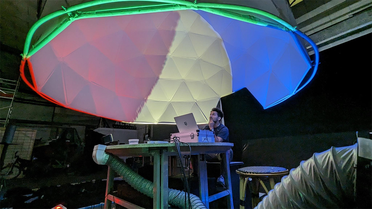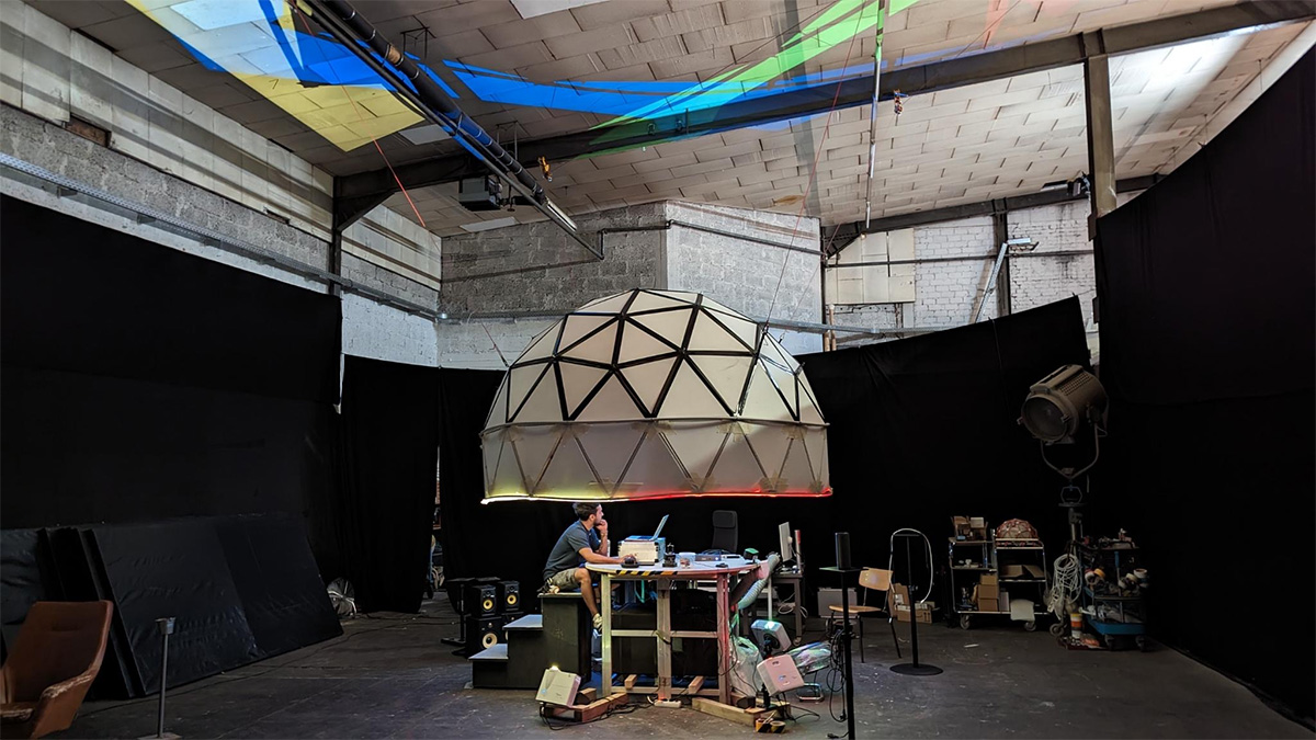 Ausgestattet mit mehreren Beamern, Lautsprechern und Ventilatoren ermöglicht diese Kuppel eine dreidimensionale, audiovisuelle und synästhetische Kommunikation zum Betrachter*in. So ergibt sich ein Zusammenspiel mehrerer Sinneseindrücke, die sich zu einer Wahrnehmung vereinen.