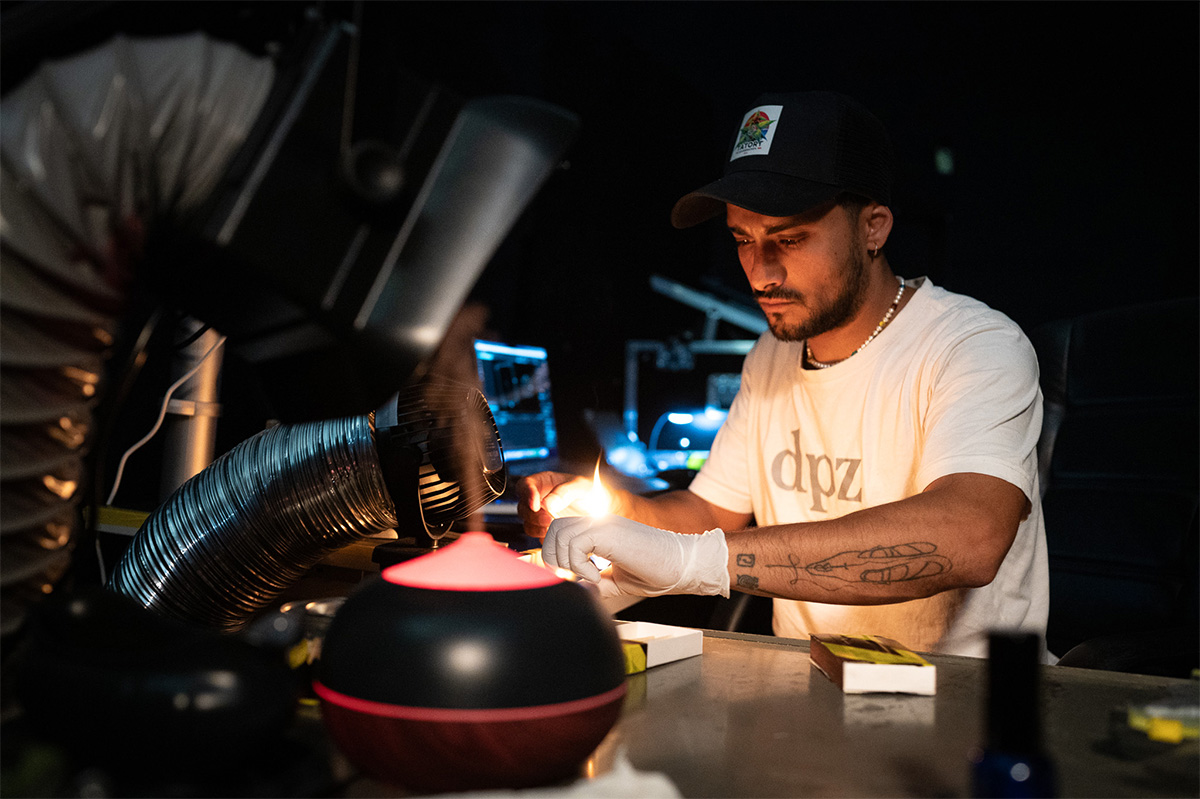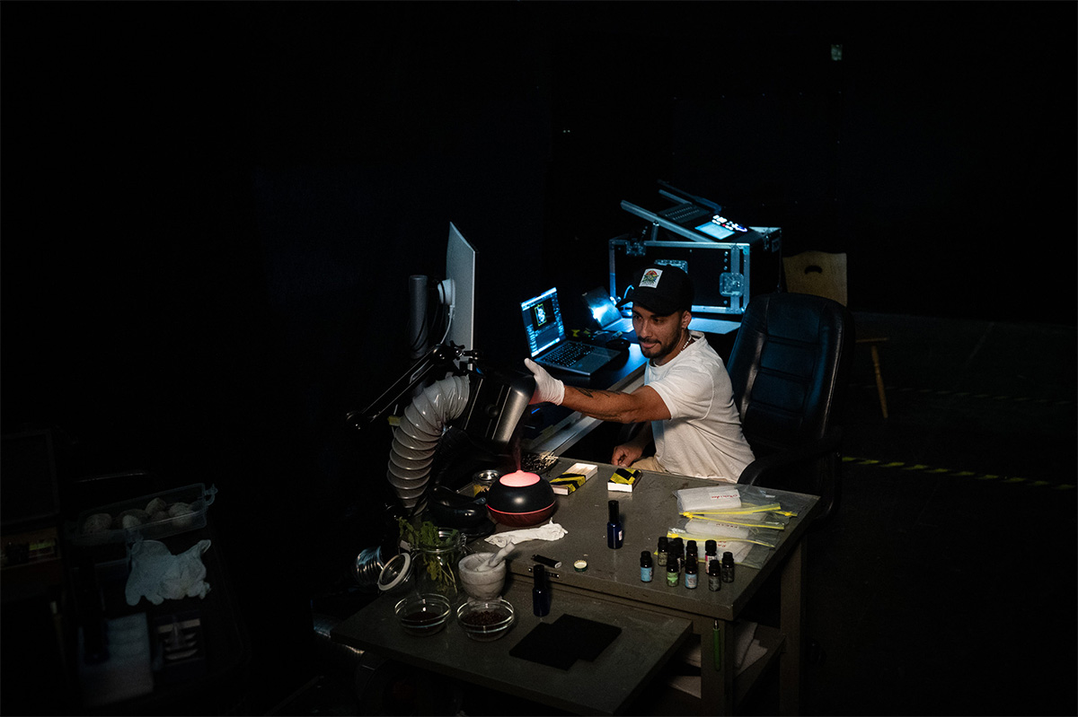 Nico Philippe Burgard an seiner Kontrollstation des SPACE FOR MULTISENSORING RESEARCH. Hier laufen alle Kanäle zusammen. Der Geruch wird von hier gesteuert und freigegeben. Auch die visuellen und akustischen Signale werden von hier angesteuert. Es ist fast wie eine Wahrnehmungs-DJ-Performance welche sich einzig und alleine auf eine Person