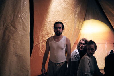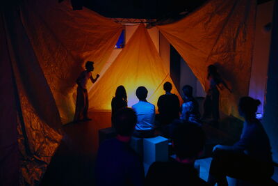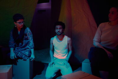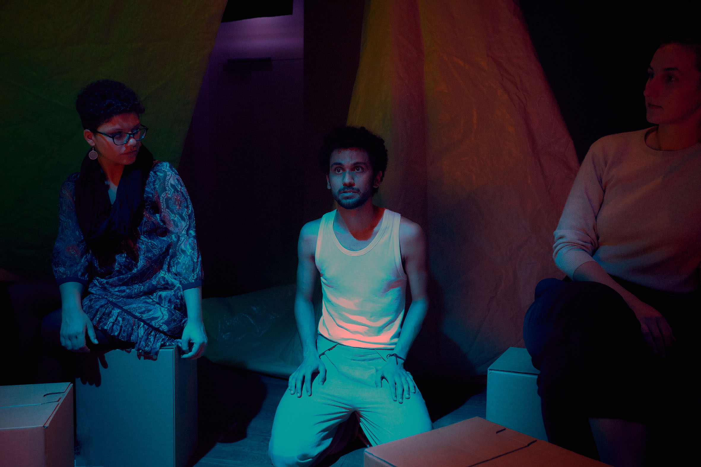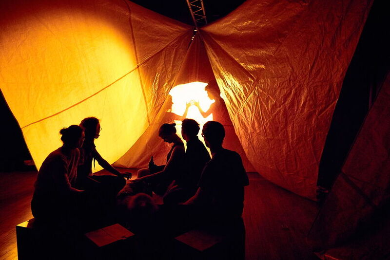 Die Zuschauer werden auf den Sitzkartons in der Mitte des Raums so platziert, dass sie keinen fokusierten Blick auf eine gegebene Bühne haben. Sie befinden sich vielmehr mitten im Bühnenbild, befinden sich in einem gefühlten Zelt, das durch die Sonnensegel entsteht, die rund um das Publikum aufgeschlagen sind.