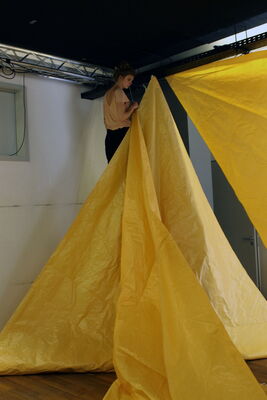 In dieser Arbeit bekleide ich den Theaterraum des "Theater im Viertel"s für die Geschichte der "Annäherung an das Unbegreifliche" von Nuria Herrmann mit folgendem Material: 8 dreieckigen Sonnensegeln, 12 Sandsäcken, 1 Overheadprojektor und feinem Sand, 4 Laternen und 25 Sitzkartons.