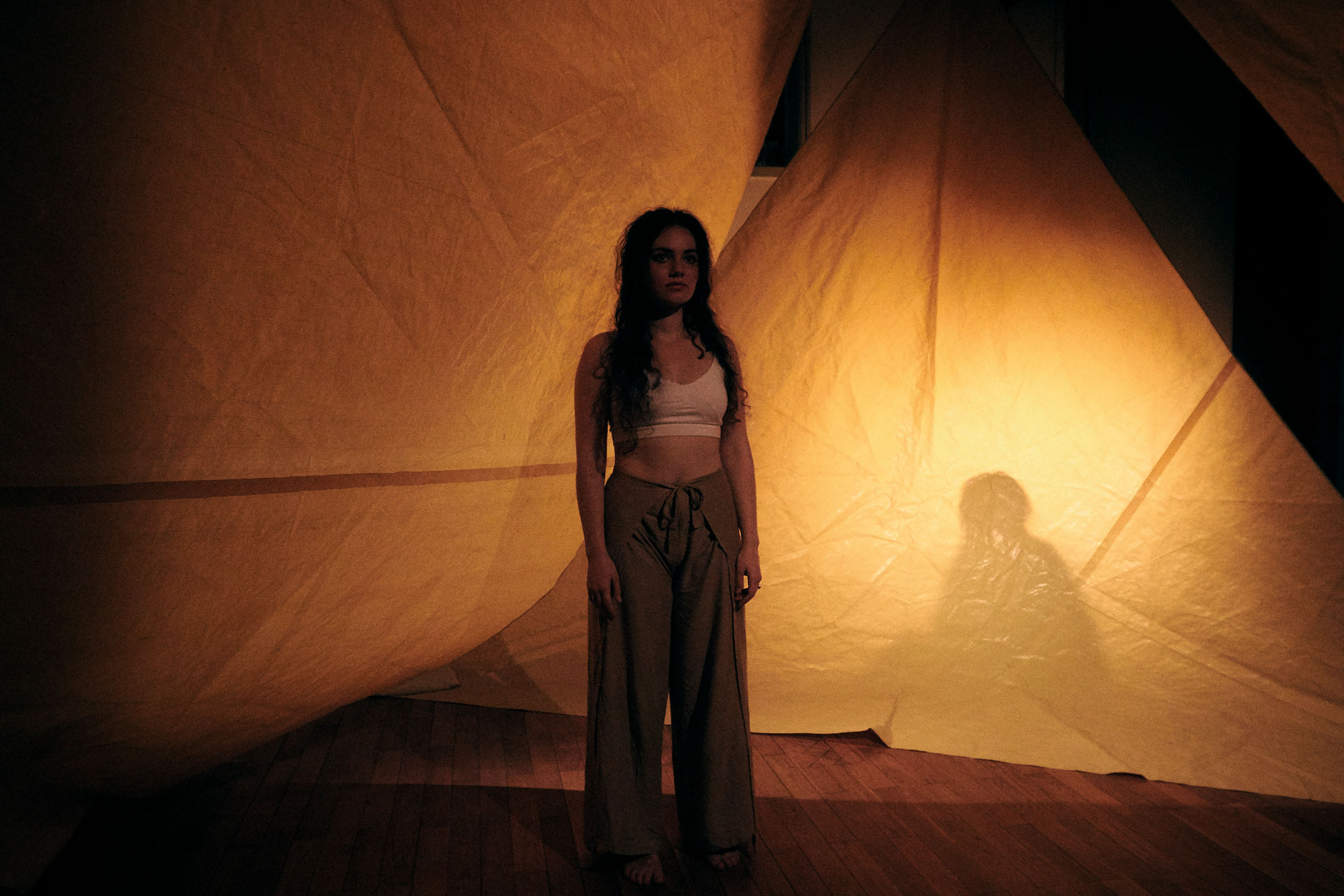 Dadurch entsteht ein Raum, der von innen und von außen bespielt werden kann. Hinter den Segeln erscheinen die Schauspieler als Schattenrisse, Stimmen und Schritte. Der Raum hinter den Segeln wird ebenfalls mit Licht- und Schattenspiel durch das Tragen der Laternen bespielt oder durch das Schreiben in Sand, das mittels eines Overheadprojektors auf ein Segel projeziert wird. Vor den Segeln werden die Schauspieler als Figuren sichtbar, spielen sehr nah im und um das Publikum herum, so dass sich dieses mitten im Geschehen, in der Geschichte wiederfindet.
