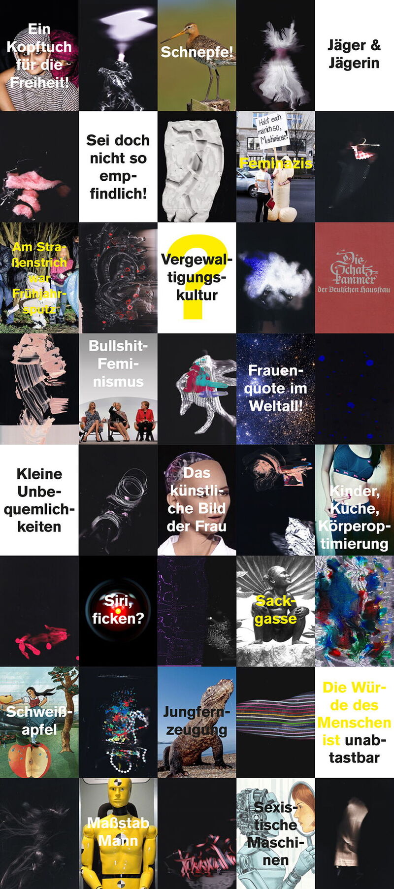 Als ich 2016 diesen Ausspruch Ivanka Trumps zum ersten Mal in der Huffington Post las, war ich schockiert und amüsiert zugleich – erscheint mir der mächtigste Mann der Welt doch als demokratisch gewählter Ausdruck eines reaktionären Gegenangriffs auf die Frauenrechte. Dass sich die Tochter des US-Präsidenten über das Feminismus-Verständnis ihres Vaters definiert und sich darüber hinaus als Marke präsentiert, wirkt im Weltkontext gesehen grotesk und besorgniserregend. In Zeiten, in denen der Feminismus mit etlichen Vorurteilen zu kämpfen hat, zugleich aber längst in der Popkultur und den Modeketten angekommen ist, stellte ich mir daher die Frage: Wie steht es eigentlich um das Bild der Frau in der Gesellschaft? Das Ergebnis ist eine Bestandsaufnahme von heute bis gestern. Mir war es wichtig, dass meine Arbeit keinen belehrenden oder selbstgefälligen Unterton aufweist, sondern, dass meine Recherche möglichst großflächig das Bild der Frau in unserer Gesellschaft darstellt und dokumentiert.