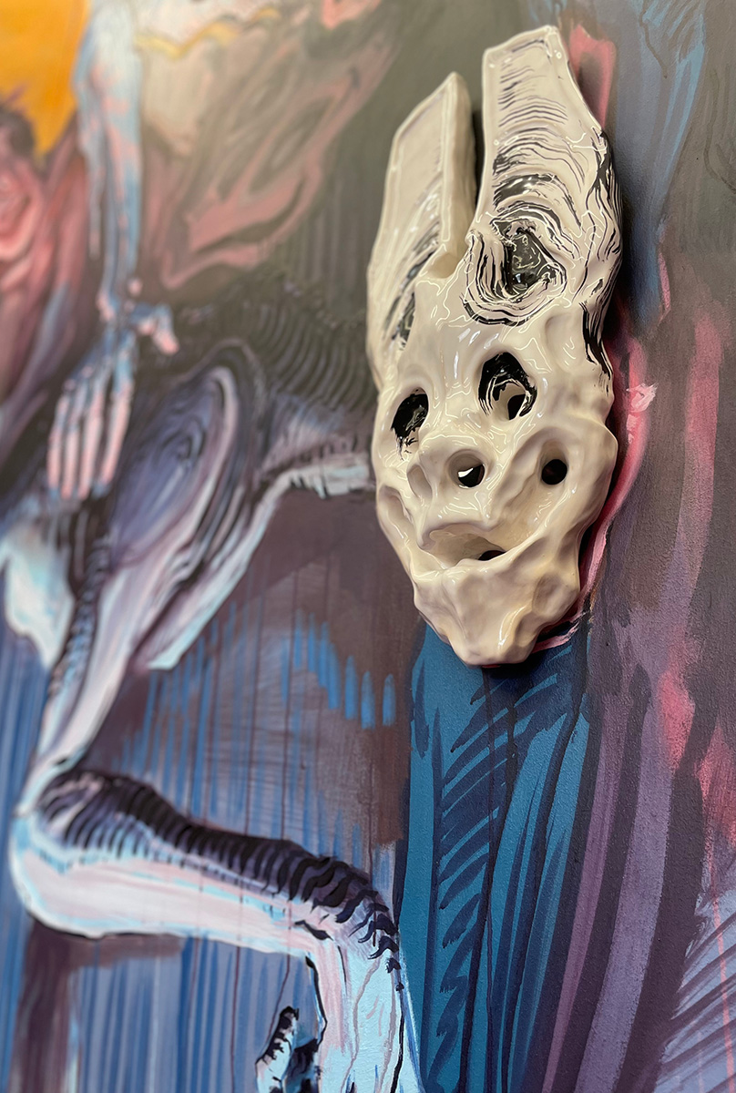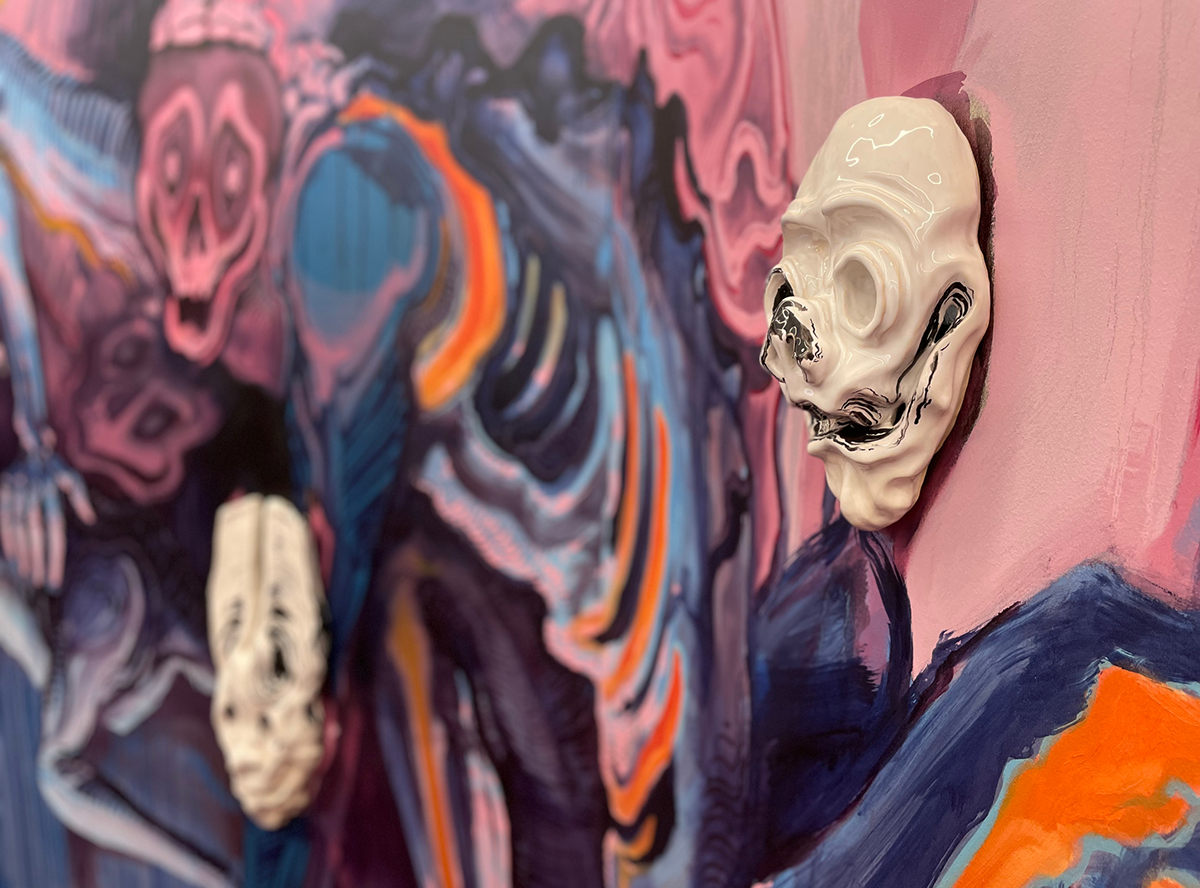Die Anderen ist eine Rauminstallation, welche sich aus 8 bemalten Holzplatten, 17 Keramikmasken und einem Teppich zusammenfügt.