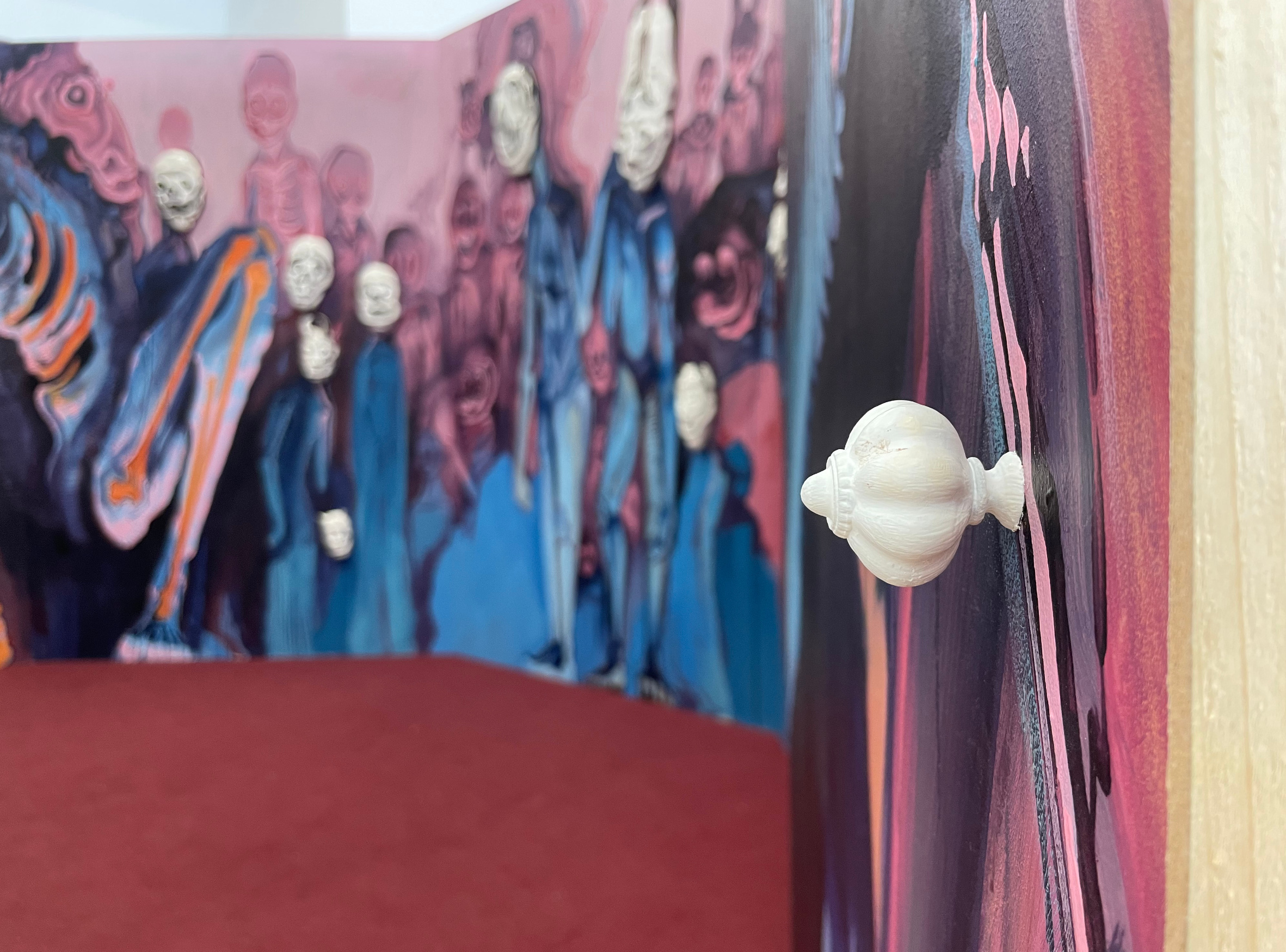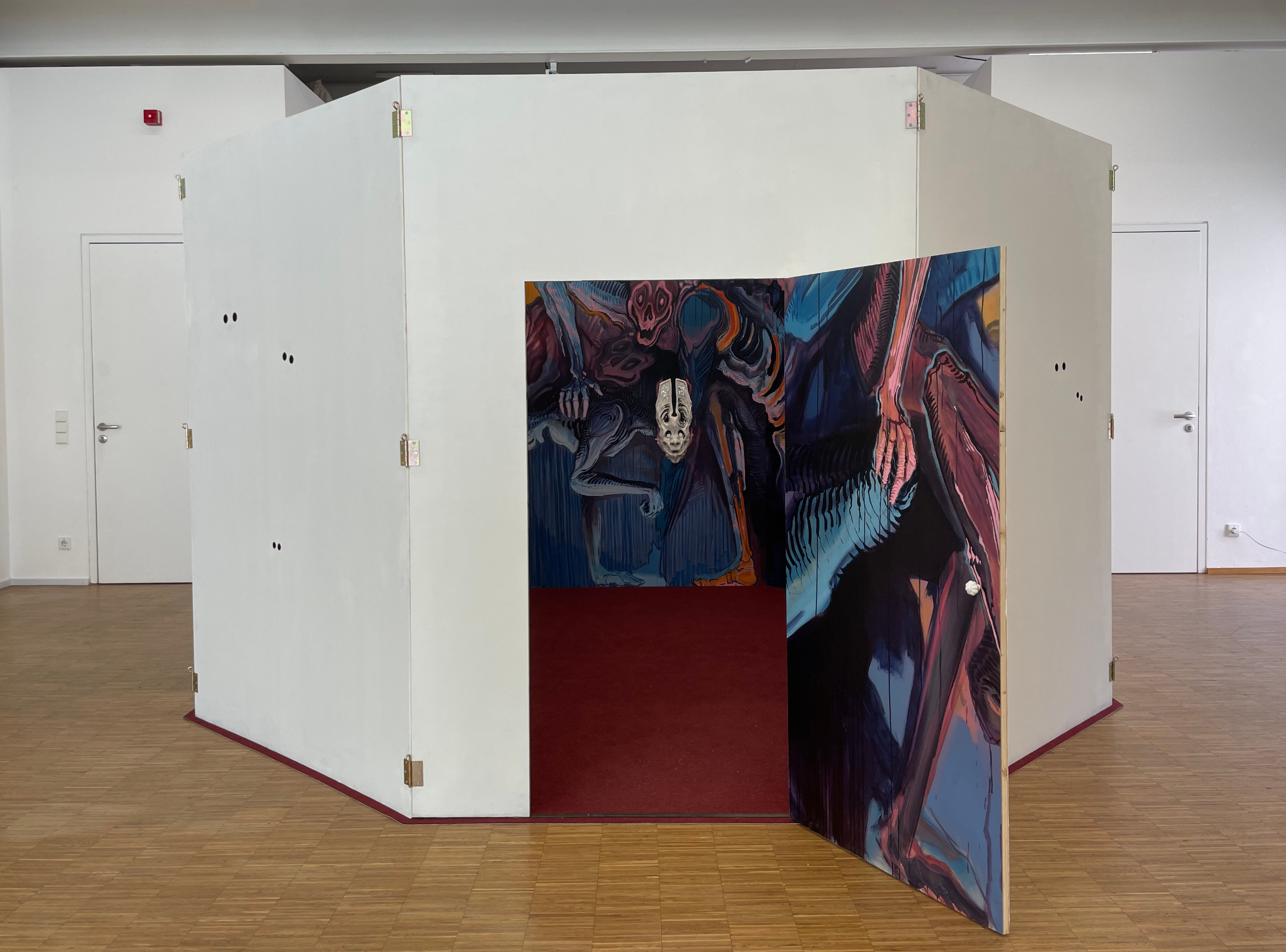 Durch eine Türe kann die Arbeit betreten werden. Im Inneren hat man freie Sicht auf die Malerei und die Keramikmasken. Die Besucher*innen treten nun zum einen wieder in eine beobachtende, zum anderen jedoch auch, durch die Blicke von außen, in eine beobachtete Position.