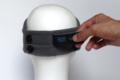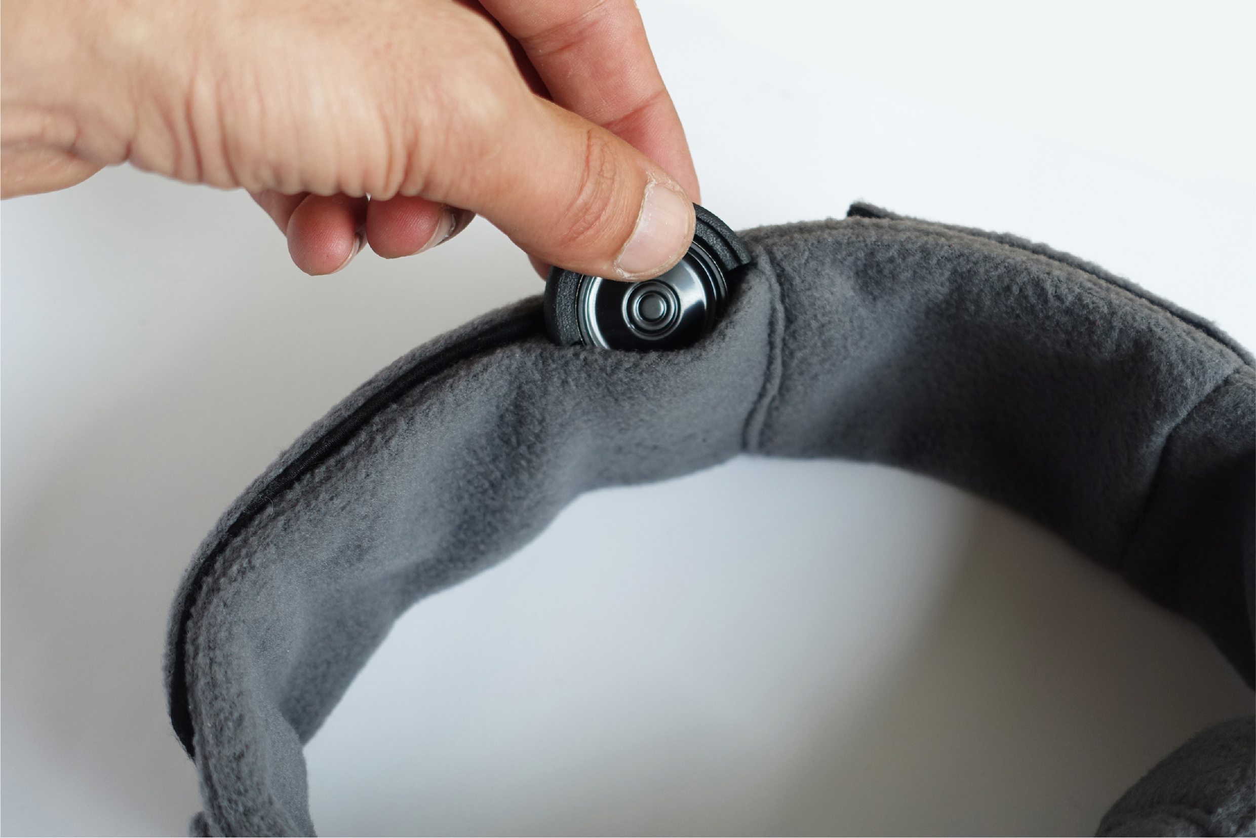 Durch einen Handgriff wird das Kopfband zu einer Schlafbrille erweitert. Dieser entstandene „Persönliche Raum“ erleichtert das Entspannen um ein Vielfaches. Bei Bedarf und je nach Stimmung, können die integrierten Kopfhörer zugeschaltet werden, um die Entspannungsphase mit Musik, Hörspielen usw. zu unterstützen. Genau auf Höhe dieser Lautsprecher befinden sich kleine „Knubbel“, welche die intuitive Positionierung des Kopfbandes maßgeblich vereinfachen.