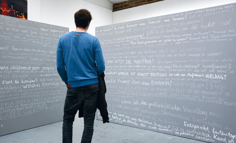 Während des Workshops wurden sehr viele Fragen aufgeworfen. Sie regen zum Weiterdenken an. Sie fordern dazu auf, Stellung zu nehmen und sich selbst zu positionieren. Und sie lassen sich vor allem nicht vollends beantworten. Aus diesem Grund stehen die Fragen sowohl im gedanklichen als auch im räumlichen Zentrum des Konzepts. Mit dem Betreten des Kubus im Atelier liefert man sich als Rezipient den zahlreichen Fragen aus. Man wird dazu angeregt, sich mit ihnen auseinanderzusetzen.
