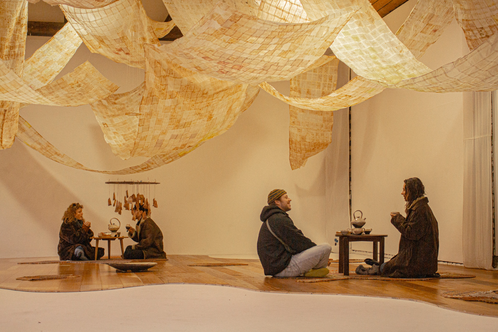 Der Raum war zweigeteilt. Über zwei Drittel ergießt sich ein wellenförmig zugeschnittener Holzboden, durchsetzt mit organisch geformten, fragmentierten Teppichinseln, die eine warme, einladende Atmosphäre schufen. Darüber schwebten Bahnen aus Teebeuteln. Der angrenzende weiße Bereich wirkte ruhiger, fast zurückhaltend, und bot Raum für Rückzug. Besucher sind eingeladen beim Betreten die Schuhe auszuziehen. Die beiden Seiten bedingen einander und bieten einen Ausgleich.