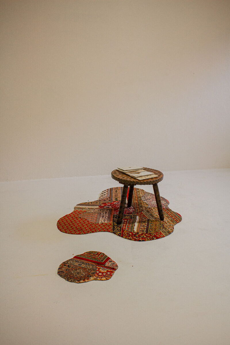 Der Raum war zweigeteilt. Über zwei Drittel ergießt sich ein wellenförmig zugeschnittener Holzboden, durchsetzt mit organisch geformten, fragmentierten Teppichinseln, die eine warme, einladende Atmosphäre schufen. Darüber schwebten Bahnen aus Teebeuteln. Der angrenzende weiße Bereich wirkte ruhiger, fast zurückhaltend, und bot Raum für Rückzug. Besucher sind eingeladen beim Betreten die Schuhe auszuziehen. Die beiden Seiten bedingen einander und bieten einen Ausgleich.
