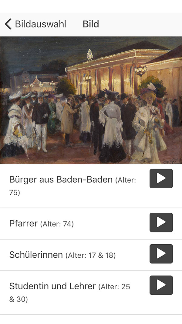 In diesem Bericht geht es um die Ausarbeitung einer kuratorischen Kunstvermittlung im Museum LA8 für Kunst und Technik des 19. Jahrhunderts in Baden-Baden. Ich werde hier die Methode des dialogischen Sehens vorstellen. Sie beschäftigt sich mit der Wahrnehmung von Kunst im musealen Raum. Grundsätzlich umfasst sie zwei unterschiedliche Ebenen. Zum einen die unmittelbare Ebene eines Dialogs vor einem Kunstwerk und zum anderen die Ebene des vermittelten Dialogs durch das Hören von Gesprächen über ein Bild. Die Idee beinhaltet den Wunsch, Menschen im Museum zum längeren Verweilen vor Bildern zu motivieren. Darüber hinaus will ich erreichen, dass der Besucher hinterfragt, was er sieht und es auf seine eigene Lebenswelt bezieht. Im gedanklichen Dialog mit den Bildern sollen die Betrachter der Kunstwerke ein Handwerkszeug erlernen, das sie dazu befähigt, anderen Bildern mit dieser Methode zu begegnen. Anschließend erarbeitete ich ein Vermittlungskonzept in Form der App „ARCS AUDIO“ und setzte diese in der Ausstellung „Natur und Kulisse – Vornehme Parallelgesellschaften im 19. Jahrhundert“ im Museum LA8 um.