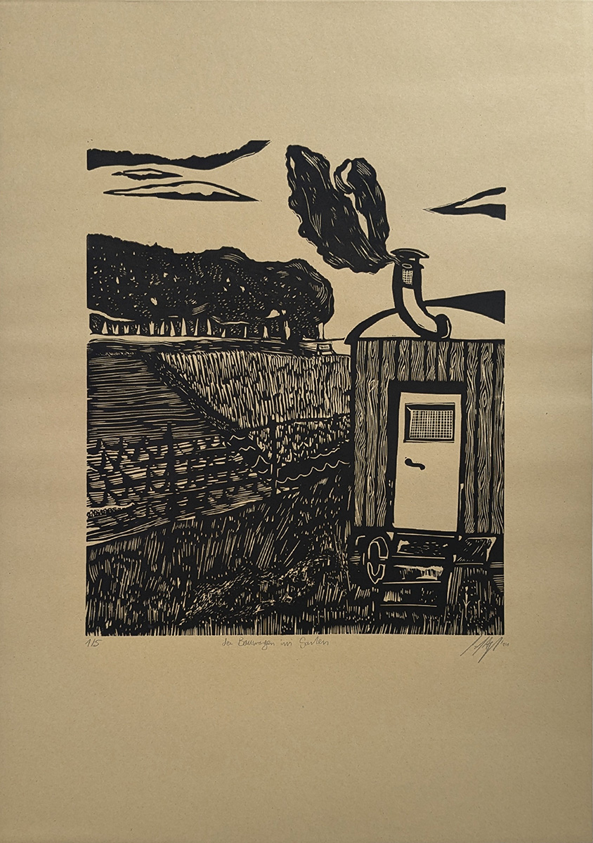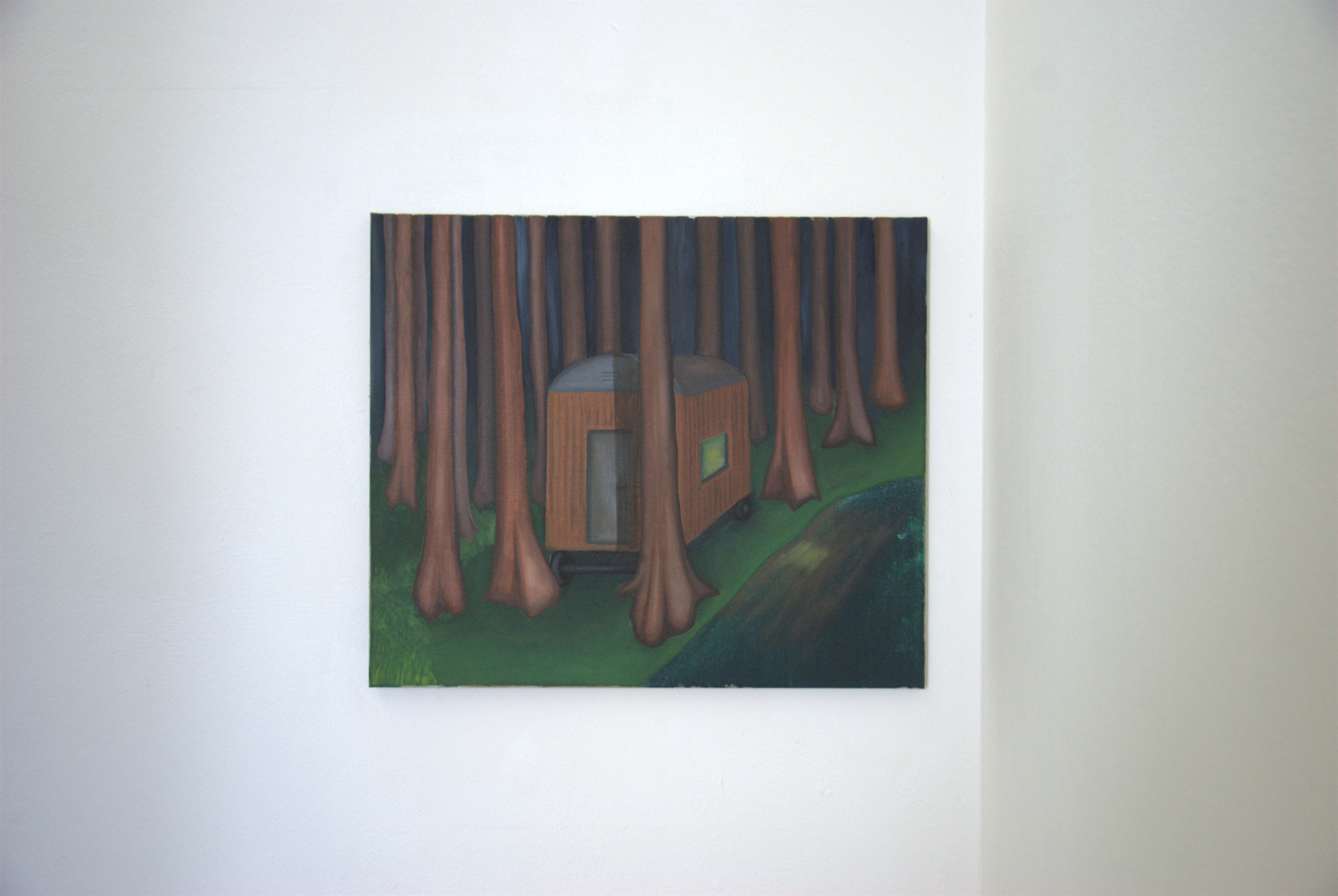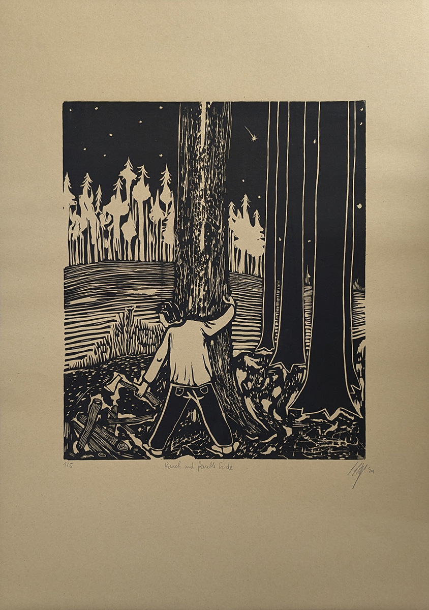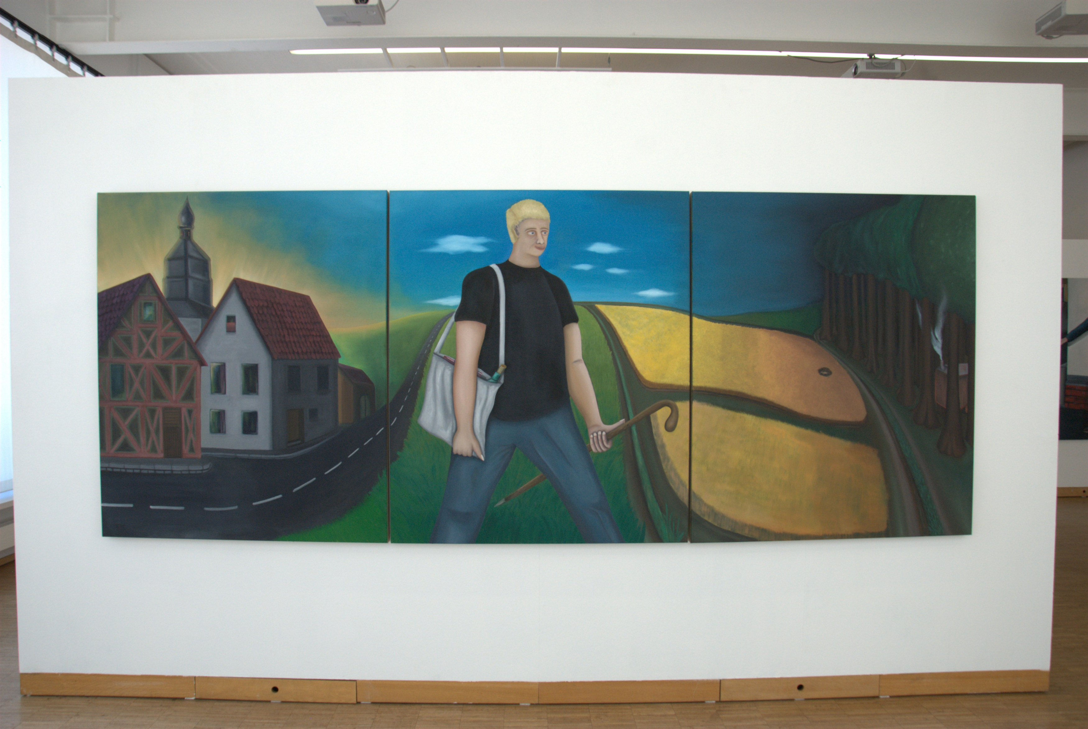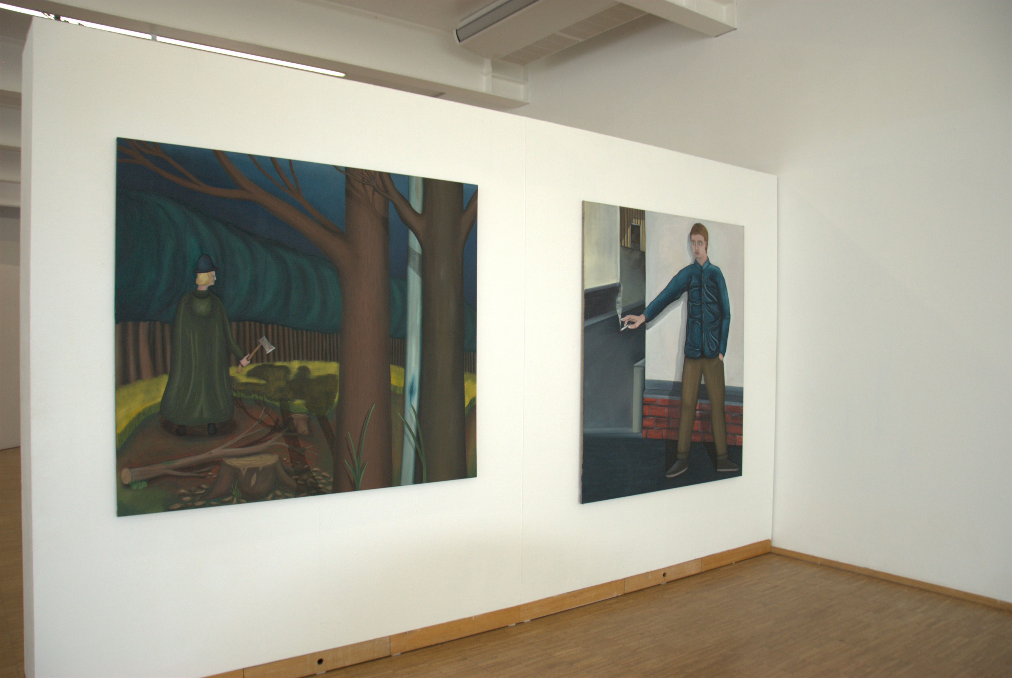 Der praktische Teil hat sich sehr auf die Umsetzung vieler Ideen, Erinnerungen und Geschichten aus der eigenen Jugend konzentriert. Das Hauptelement bildet das Triptychon Ein Stich in die Gemarkung (130 cm x 330 cm (3 x 110 cm), Öl und Acryl auf Leinwand) und vereint alle weiteren Werke oder zitiert diese. Diese Position wurde als erstes gemalt und alle weiteren Bilder entstanden durch dieses erste, wichtige Bild. Weiterhin gab es zwei Bilder, die sich mit der Thematik der Bauwagen auseinandergesetzt haben: Bauwagen am Weiher (55 cm x 65 cm, Öl und Acryl auf Leinwand), Rast und Ruhe (155 cm x 165 cm, Öl und Acryl auf Leinwand). Eine Position hat sich mit der Thematik der Langeweile und des Versteckens auseinandergesetzt: Die letzte Zigarette – vorerst (150 cm x 130 cm, Öl und Acryl auf Leinwand). Die Position: Da gibt es noch Arbeit. Mein Freund (130 cm x 150 cm, Öl und Acryl auf Leinwand) befasst sich mit der eigenen Vorstellung eines Waldarbeiters aus dem 19. Jhdt. Hinzukommend noch drei Hochdruckpositionen. Diese wurden alle aus Linoleum als Druckstock gefertigt und behandeln schnelle, flüchtige Erinnerungen aus der Jugendzeit im Dorf. Alle drei Druckstöcke sind auf einem DIN A2 Papier gedruckt. Die Titel lauten: Rauch und feuchte Erde. Ich bin dann mal weg. Der Bauwagen am Garten.