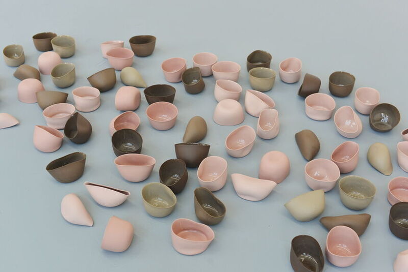 Um meinen Bezug zum menschlichen Körper zu visualisieren, habe ich mich mit Farben von Haut im Porzellan beschäftigt. Meine Installation beinhaltet helle und dunkle Hauttöne. Auch wenn diese Hauttöne nicht die ganze Vielfalt menschlicher Hauttöne auf der Welt abbilden, so sind sie doch stellvertretend als solche von mir gemeint; die entstandenen Hauttöne sind abstrakt, wie ein Gemälde zu betrachten.