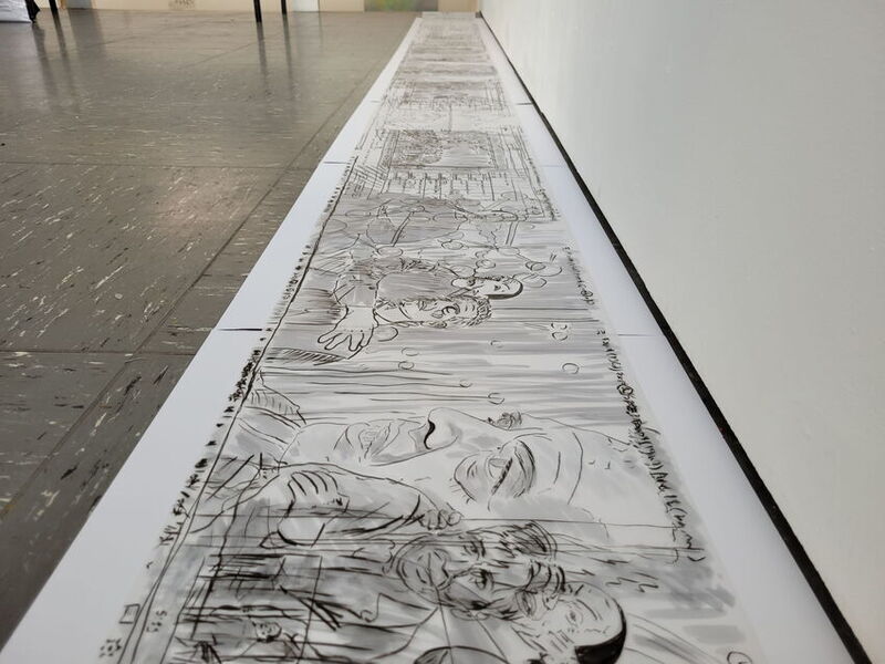 Das zweite Werk beschäftigt sich mit meinen Sehgewohnheiten bei filmischem Material. Ich stoppe einen Film Frame für Frame und übersetze die Handlung in meterlange Zeichnungen auf Transparentpapier. Nicht nur der Film wird dabei Motiv, auch seine mediale Umgebung fließt mit ein: mein Desktop, der YouTube-Player, etc. spiegeln den Entstehungsprozess wider.