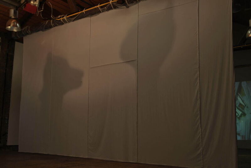 Da in Geschichte und Film eine mysteriöse Atmosphäre herrscht, habe ich versucht, diese Stimmung mit wenig Licht und viel Schatten in meiner Installation umzusetzen. In der Mitte des Raumes hängt ein weißes Tuch mit den Maßen 8 m x 4 m, worauf sich groß die Schatten einer Katze und eines Hundes abzeichnen.