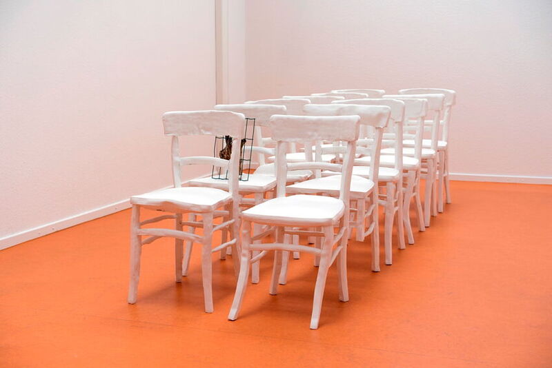 Die Installation beinhaltet zum einen eine Serie von fünf Wandobjekten. Diese bestehen jeweils aus der Fotografie eines Stuhls, welcher demontiert und zu einem Rahmen verarbeitet wurde, in dem anschließend sein Abbild gefasst wird. Zum anderen beinhaltet sie eine Gruppe von 12 Gipsskulpturen, eine Reihung von Abgüssen eines Sprossenstuhls. Sie haben dasselbe Stuhlmodell als Ausgangspunkt und weisen doch, bedingt durch den Prozess des Abgießens, durch Zufall und gezielte Manipulationen, alle eine individuelle Formung auf. Teilweise sind diese Unterschiede nur sehr subtil, manche Modelle nehmen jedoch auch skurrile Formen an. Die entstandenen Variationen und Verschiebungen in der Konstruktion der Abgüsse und ihre Präsentation in einer dichten Abfolge, heben den repetitiven Moment besonders hervor. Diese Wiederholung vergrößert, steigert und übertreibt.