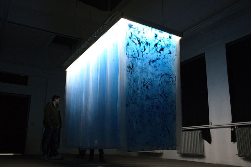 Die Arbeit von besonderer Feinfühligkeit ist eine frei im Raum hängende Lichtinstallation – durch dicht aneinandergereihte Folienschichten schimmern die händisch erstellten, individuellen Drucke und bilden im Gesamtbild einen Leuchtkörper von 3 x 2 x 1,4 m.