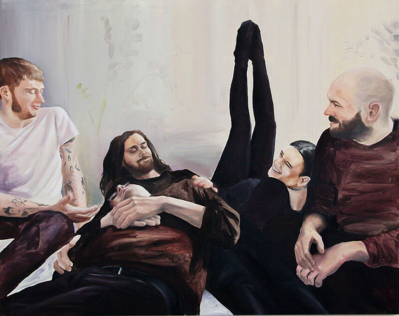 Durch das Organisieren von Konzerten mit dem Haifischblut Collective und dem Beherbergen der Bands in meiner Wohnung, habe ich diese Situation regelmäßig erfahren können. Aus der Auseinandersetzung mit dem Thema sind Malereien entstanden, die sowohl inhaltlich als auch formal das besondere Gefühl von Freundschaft, Intimität und Geselligkeit einfangen.