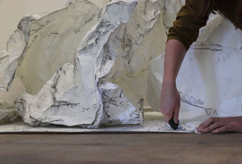 Hier und jetzt halte ich mich auf; ganz unmittelbar wie in einer Landschaft und zeichne. Das Feld bearbeiten und pflügen. Falzen, Ziehen, Nachziehen. Gestik der Hand, des Körpers und des Raums. Die Handlung wird zur Bewegung. Die Lineatur wird zum Körper. Die Fläche wird zum Implikationsfeld. Bin ich nur Beobachterin dieser Prozesse? Ist es die Bewegung selbst, die zu Spuren führt? Versunken in zeitlosem Tun trete ich für einen Moment zur Seite. Steige aus der schnelllebigen Welt aus. Nur kurz. Aber nicht ganz. Räumlich-Zeitlich-Seiend Zeichnungsräume bildend.