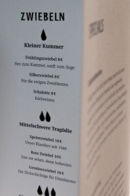 Gäbe es den Zwiebelkeller wirklich, wie würde er aussehen? Was würde in der Speisekarte stehen? Ließe er sich in die heutige Zeit übersetzen? Und kann man ein Ladenkonzept wie dieses in eine Hand voll Headlines packen? Mit all diesen Fragen habe ich mich im Rahmen meiner Bachelorarbeit im Fach Kommunikationsdesign beschäftigt. Ich recherchierte, konzipierte, gestaltete und weinte ein Semester lang. Entstanden sind am Ende ein Erscheinungsbild mit Logo, Speisekarten und Innenausstattung sowie verschiedene Werbemaßnahmen – Plakate, Give-Aways und eine Website –, die dem bisher ausschließlich literarischen Lokal eine reale Identität geben sollten.